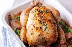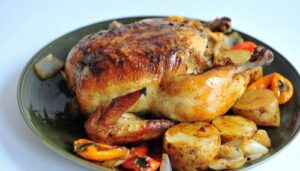 - ثم توضع الصينية إلى الفرن مرة أخرى لمدة دقيقتين ثم يتم إخراج الصينية من الفرن ووضع الدجاجة في طبق التحضير ويتم وضع حولها قطع من الكزبرة الخضراء حتى يتم تزيينها وتقديمها بأفضل شكل و بأشهى طعم ورائحة.