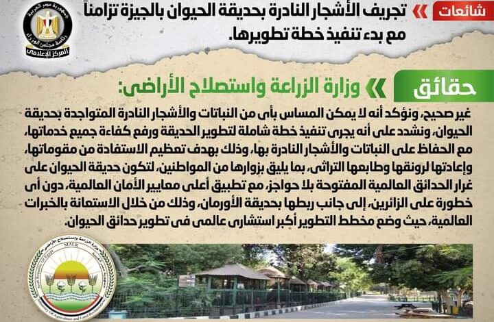 قام المركز الإعلامي لمجلس الوزراء بالتواصل مع وزارة الزراعة واستصلاح الأراضي، والتي نفت تلك الأنباء، مُؤكدةً أنه لا صحة لتجريف الأشجار النادرة بحديقة الحيوان بالجيزة تزامناً مع بدء تنفيذ خطة تطويرها، وأنه لا يمكن المساس بأي من النباتات والأشجار النادرة المتواجدة بحديقة الحيوان.